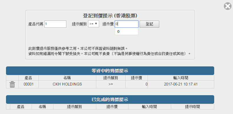 a) 於主頁面點擊 <證券市場>之 <到價提示>,當現價到達客戶的價格提示,便會顯示一個提示訊息